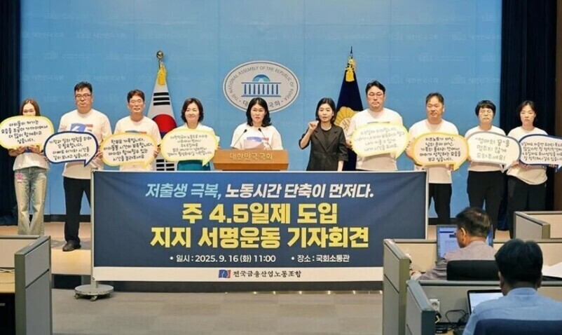 금융노조 총파업 2025의 핵심 요구사항인 주 4.5일제 도입 지지 서명운동 기자회견 현장