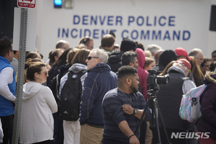 덴버 경찰 사건 지휘소 앞에 모인 언론인들과 시민들